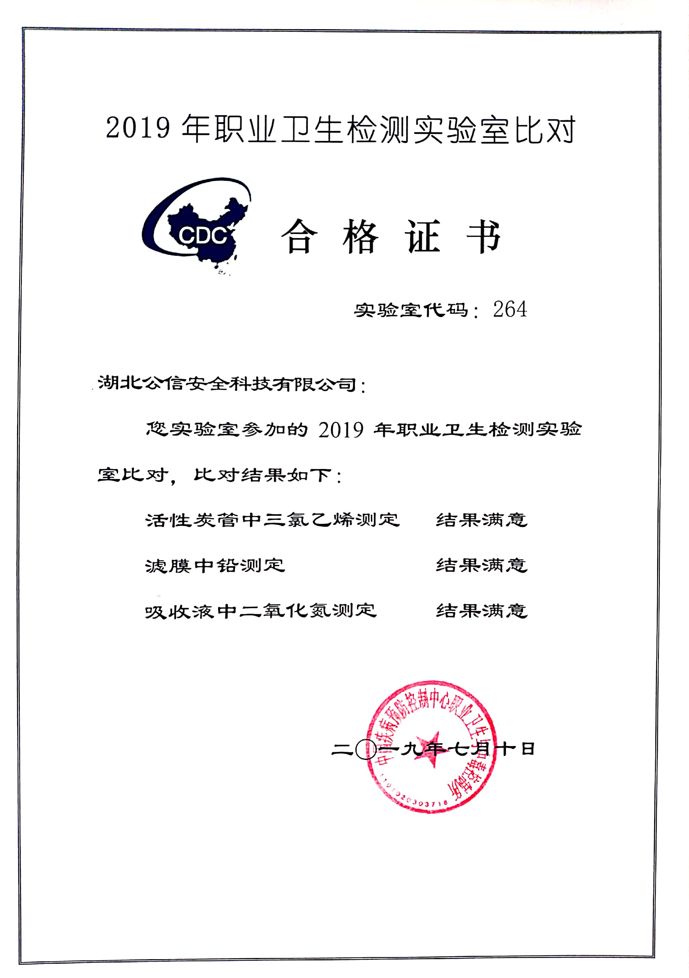 2019年7月10日,湖北公信安全科技有限公司在中國疾控中心組織的實驗室能力比對活動中取得三項檢測結果均為“滿意”的成績。